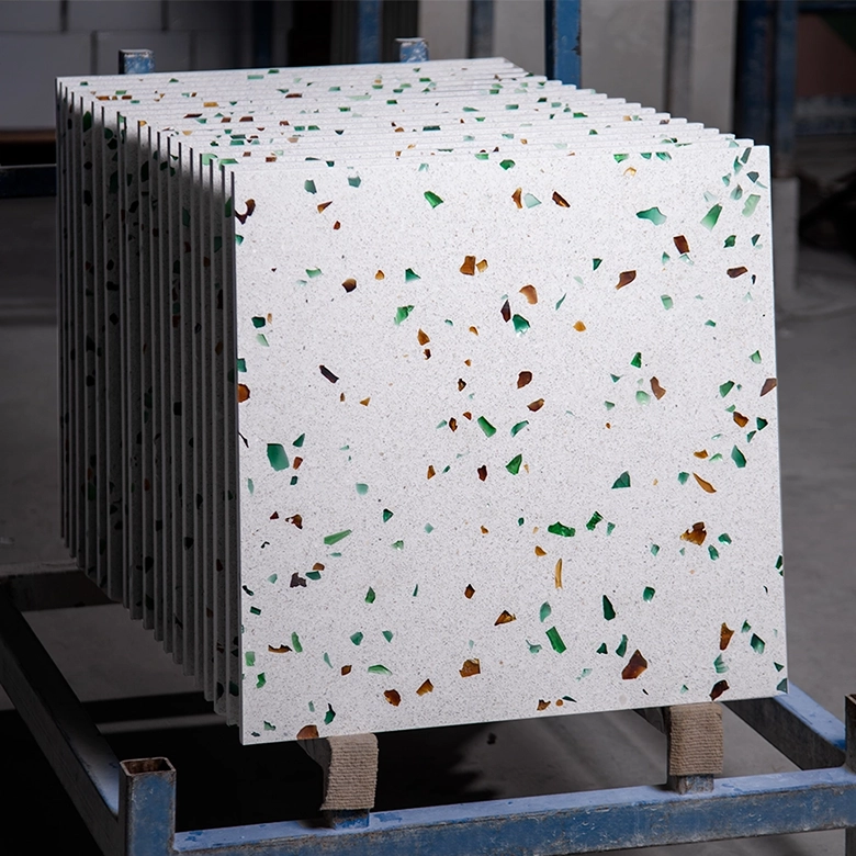 Beispiel für Terrazzo in 60x60 cm – Jede Fliese ist ein Unikat und weist leichte Unterschiede im Motiv und Farbton auf.