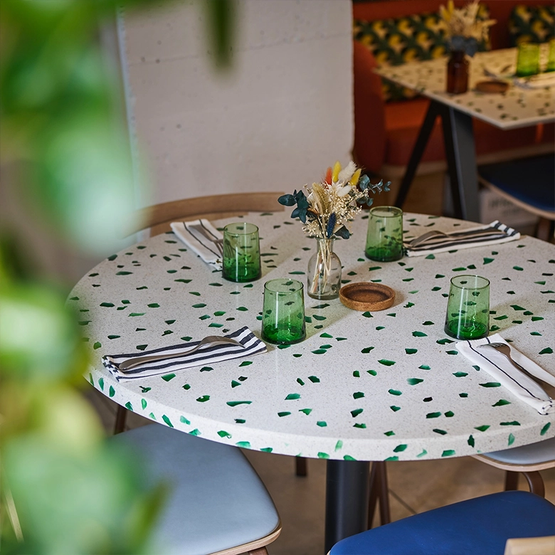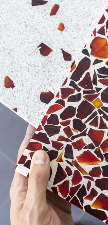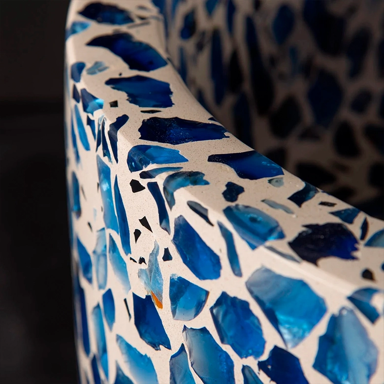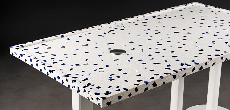 Die Helligkeit der Cristal Kollektion in einem weißen Hochleistungsbindemittel mit sehr feinen Körnern. Ein modernes und exklusives Material der Mosaic Factory Werkstätten. Aus diesem außergewöhnlichen Material stellen wir Tischplatten, Fliesen, Tishplatten oder geformte Becken her.