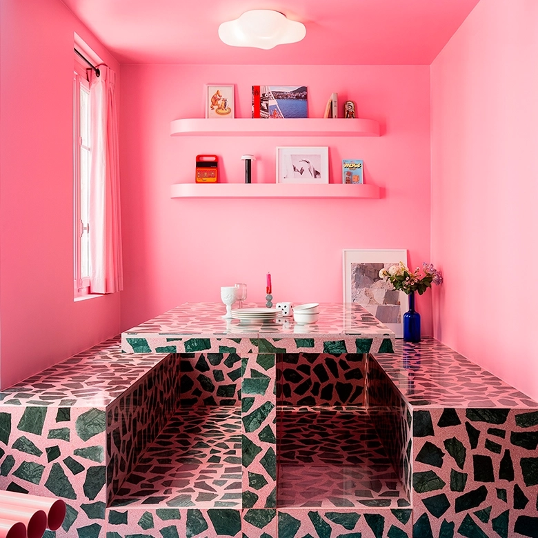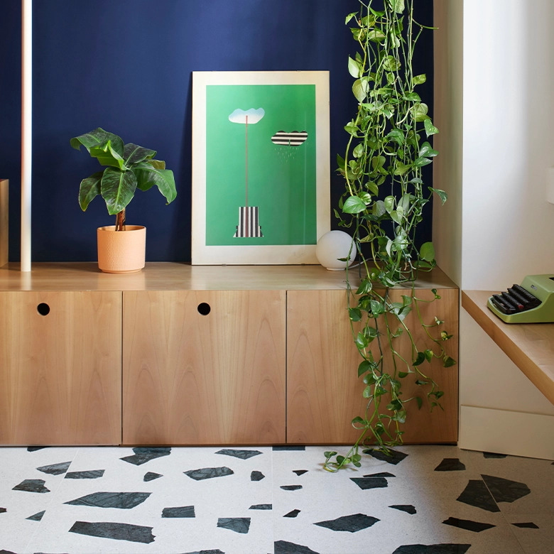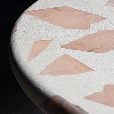 GalerieBeispiel für Terrazzo in 60x60 cm – Jede Fliese ist ein Unikat und weist leichte Unterschiede im Motiv und Farbton auf.