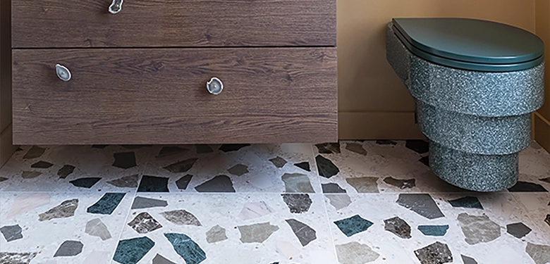 Beispiel für Terrazzo in 60x60 cm – Jede Fliese ist ein Unikat und weist leichte Unterschiede im Motiv und Farbton auf. Bitte wählen Sie dreu Marmorfarben