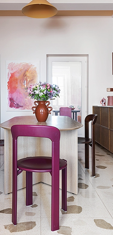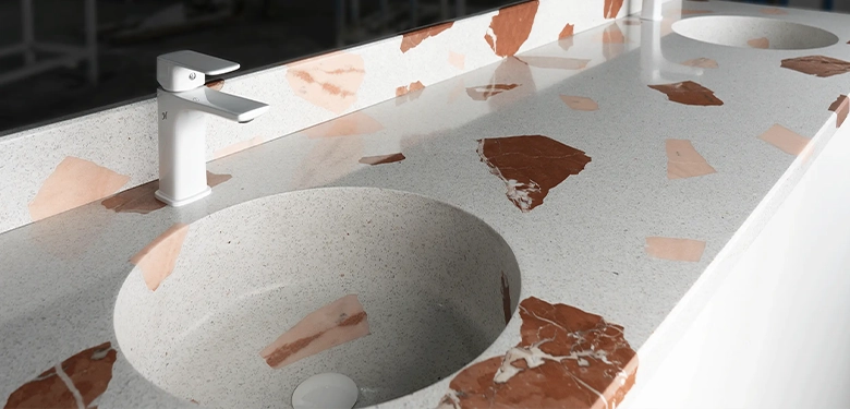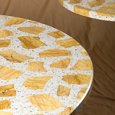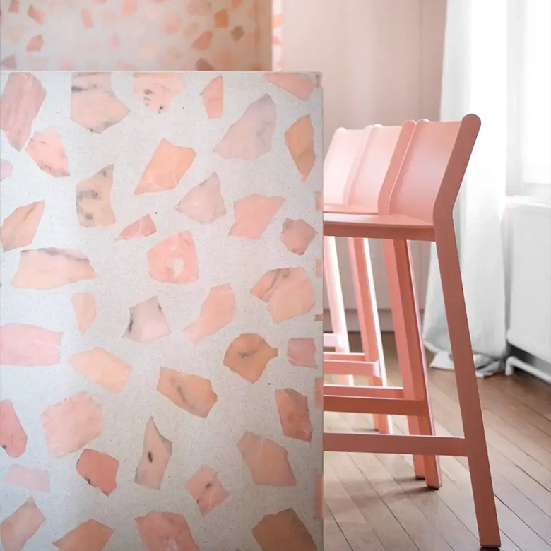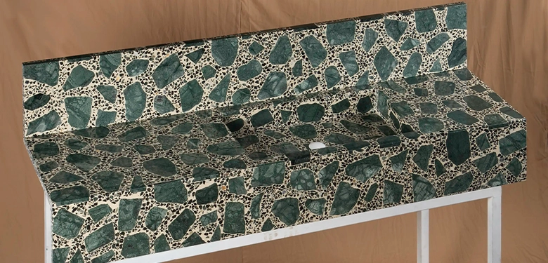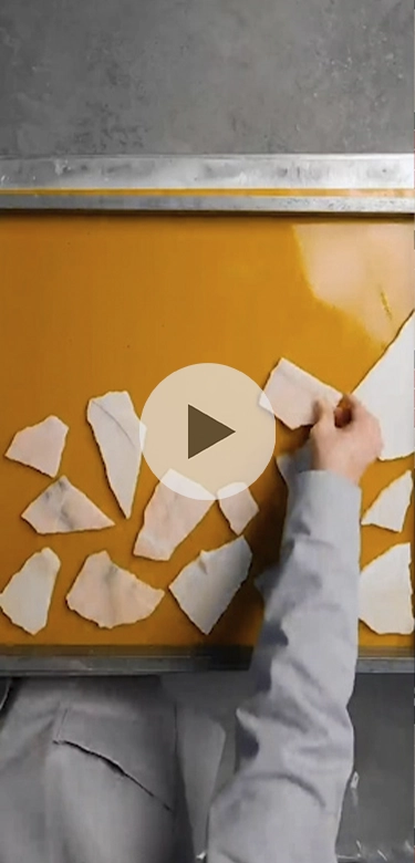 Traditioneller « Palladiana » -Terrazzo, bestehend aus unregelmäßigen Fragmenten von recyceltem Marmor. Dank der Leistungsfähigkeit von CREATZO®, unserem mineralischen Hochleistungsbindemittel, stellen wir widerstandsfähige und sehr kompakte Palladiana-Platten ab einer Dicke von 16 mm her.